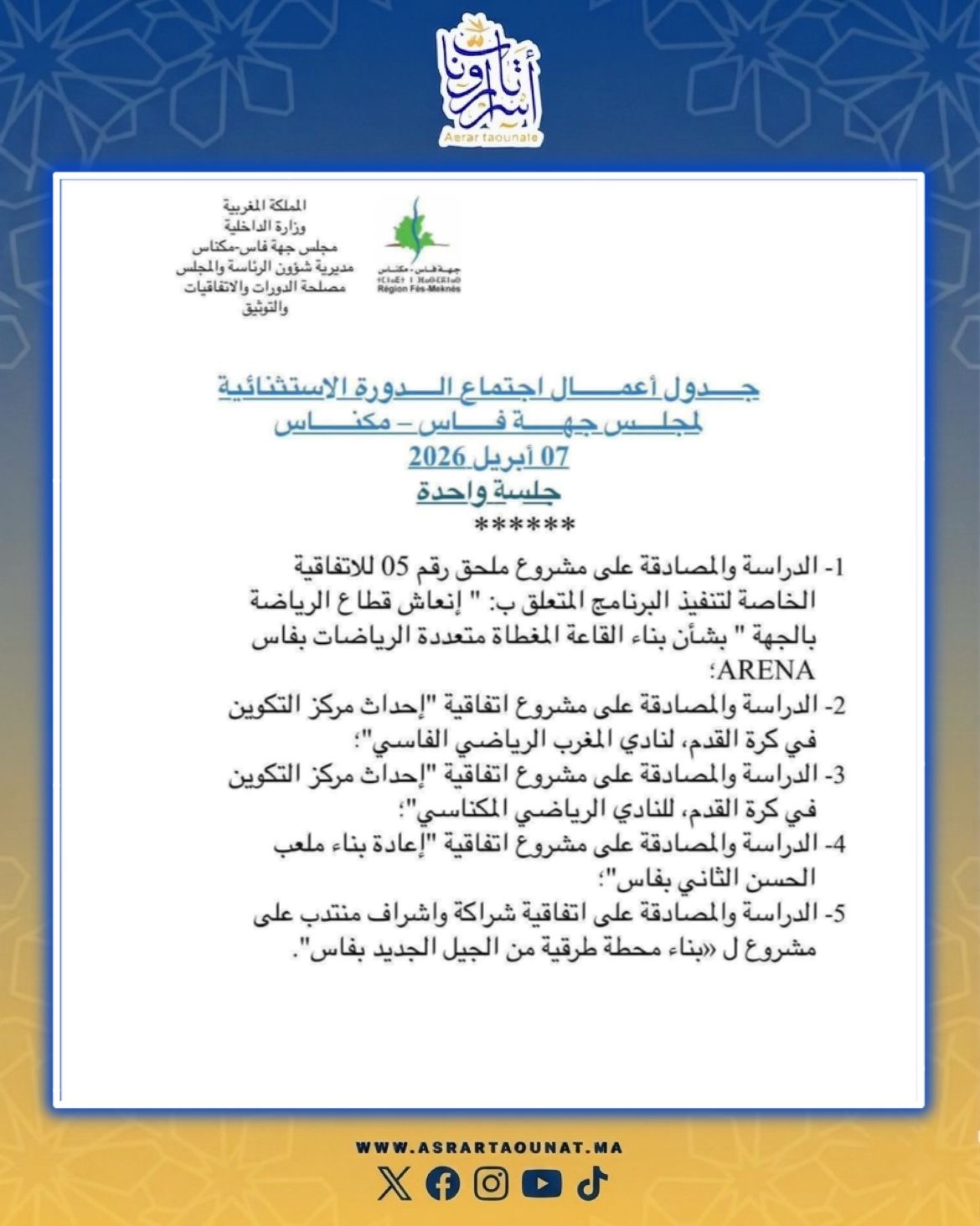 بمناسبة تخليد الذكرى التاسعة عشرة لإنطلاق المبادرة الوطنية للتنمية البشرية في مرحلتها الثالثة التي أعلن عنها صاحب الجلالة الملك محمد السادس نصره الله وأيده ، حضرنا رفقة السيد عامل إقليم تاونات المحترم ، رئيس اللجنة الإقليمية للتنمية البشرية يومه الإتنين 20 ماي بحضور السيد الكاتب العام للعمالة والسيد رئيس الغرفة الفلاحية لجهة فاس مكناس ونواب ومستشارو الإقليم في البرلمان ورؤساء المصالح الأمنية الإقليمية وأعضاء اللجنة الإقليمية للتنمية البشرية ورؤساء اللجان المحلية للتنمية البشرية ورؤساء الجماعات الترابية ورؤساء المصالح الخارجية الإقليمية وجمعيات المجتمع المدني، مجموعة من الأنشطة التي تمت برمجتها بالمناسبة من طرف اللجنة الإقليمية للتنمية البشرية، تحت شعار : ” ألف يوم الأولى أساس مستقبل أطفالنا ”
