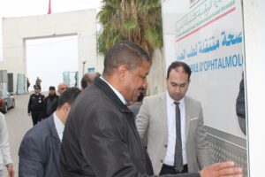 بعد ذلك، انتقل السيد العامل إلى فضاء القافلة الطبية المتخصصة في طب العيون، حيث استقبله رئيس الجمعية والمندوب الإقليمي للصحة. خلال هذه المرحلة، تم عرض طبيعة التدخلات والخدمات الطبية المقدمة، وعدد المستفيدين، والتجهيزات المتوفرة داخل القافلة. وقد تم التأكيد بشكل خاص على الدور الهام الذي تلعبه المبادرة الوطنية للتنمية البشرية بتعاونها مع جميع الأطراف، إذ ساهمت في توفير الموارد اللازمة ودعم التجهيزات، بما يجعل القافلة نموذجاً ناجحاً للشراكة بين السلطات المحلية والمجتمع المدني والجهات الداعمة للتنمية البشرية.